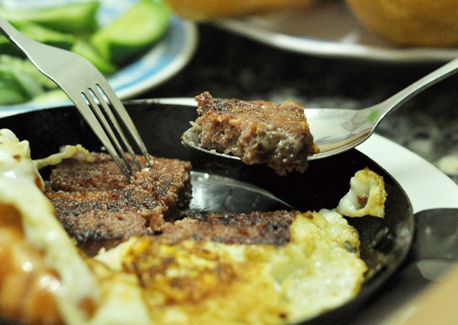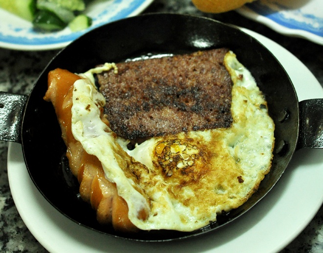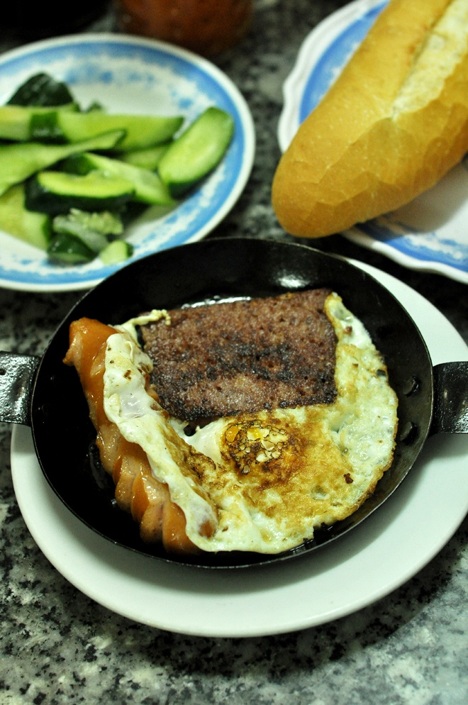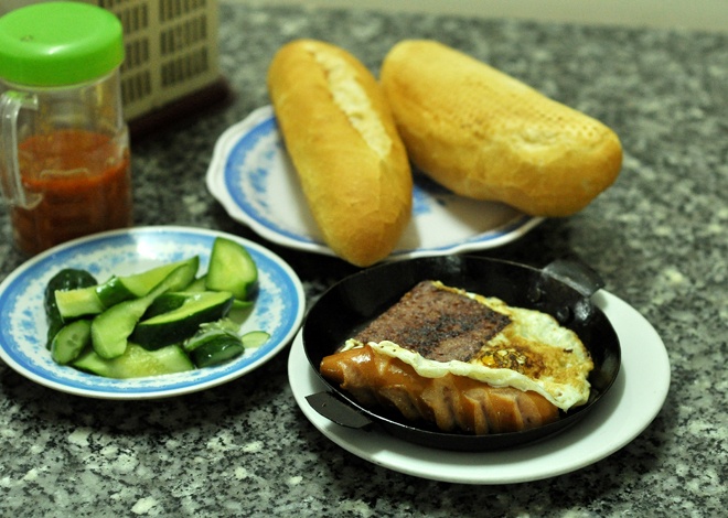 Pate, trứng và một chiếc xúc xích to mới rán trên chảo nóng hổi, kèm bánh mì giòn, dưa góp nữa là 25.000 đồng.