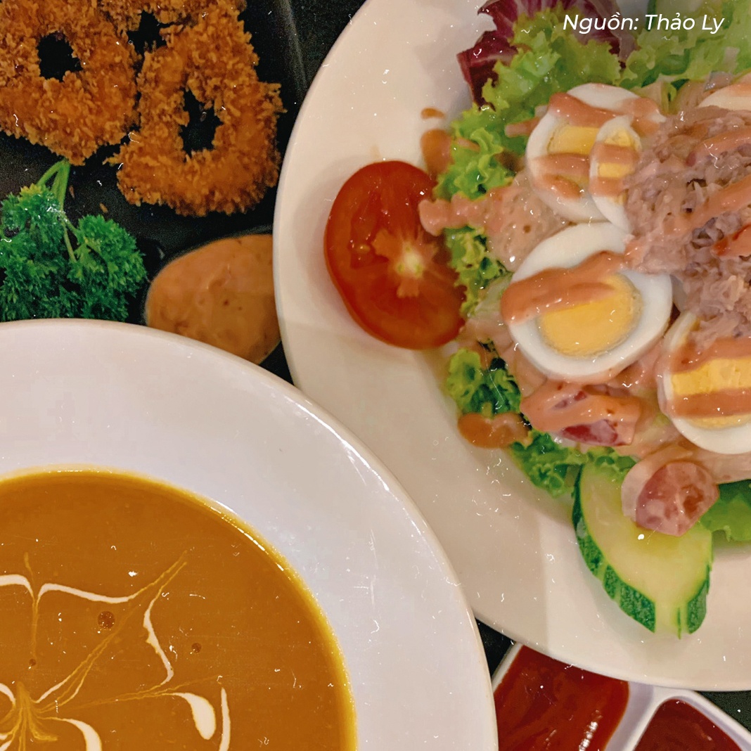 Điểm sáng của tiệm ăn nằm ở thực đơn đa dạng, giá không quá cao so với mặt bằng chung. Tôi và hai người bạn gọn một salad cá ngừ, súp bí đỏ, mực chiên xù và steak sốt tiêu xanh, mì sốt kem. Nếu là người có khẩu vị đậm, hương vị món ăn ở đây sẽ khiến bạn thất vọng đôi chút. Cá nhân tôi thích nhất món súp bí đỏ khai vị béo nhưng thơm.