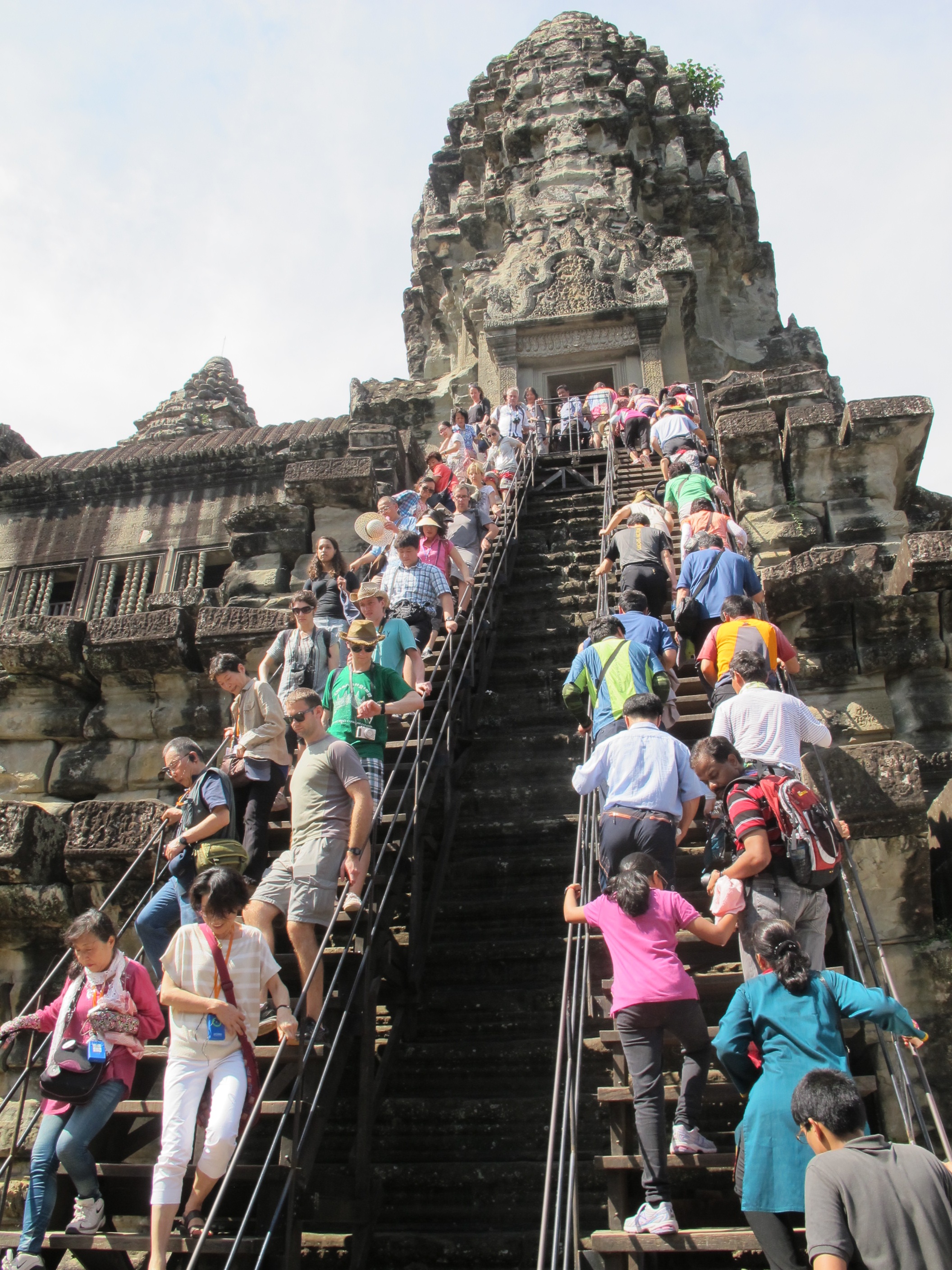 Điểm ấn tượng nữa khi tới quần thể Angkor Wat là đường lên thiên đàng. Thiên đàng ở trên đỉnh ngọn tháp cao 65m, ngọn tháp cao nhất khu quần thể Angkor Wat. Đây là một kỳ tích và còn nhiều bí ẩn của văn hóa campuchia cổ mà du khách muốn khám phá. Có một quy định cụ thể đối với du khách khi lên thiên đàng. Du khách phải mặc quần quá đầu gối. Bởi vậy rất nhiều khách đã không lên được, chủ yếu là khách phương Tây.