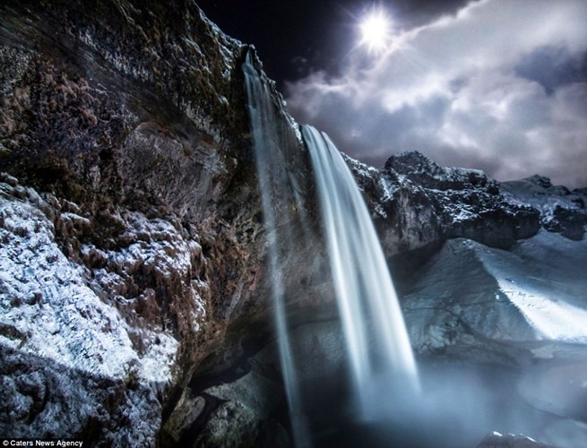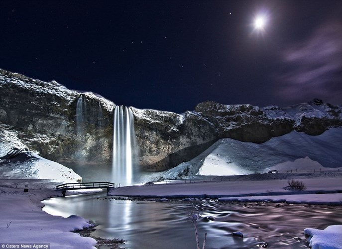 | Thác nước tự nhiên này trông thật huyền bí với những tảng đá phủ tuyết trắng lấp lánh dưới ánh trăng. |