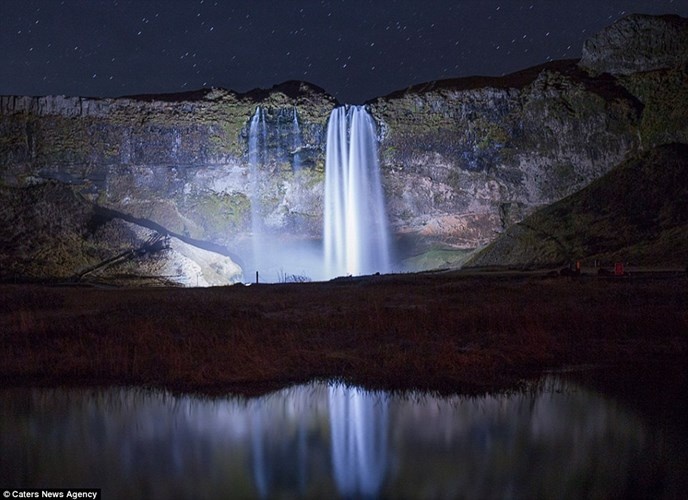 | Dòng nước được chiếu sáng tạo nên một hình ảnh vô cùng ấn tượng với bầu trời đầy sao phía sau. |