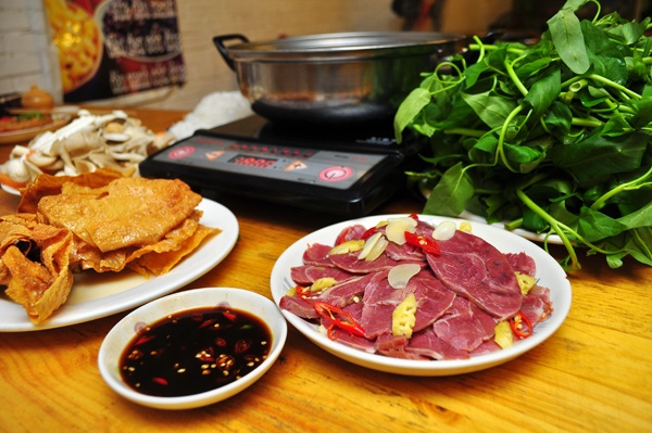 Ngoài dòng truyền thống như lẩu sườn sụn, lẩu ngà, lẩu bò thì có những món "sang chảnh", độc đáo hơn để thu hút khách. Một dạo đến tiệm, nhóm nào cũng khoái lẩu bắp bò muối chua. Bắp bò ở đây khác mọi chỗ, không phải loại chín sẵn, chần vào nước lẩu dễ bị dừ quá và mất ngọt, mà thịt bò muối khi còn sống, thớ thịt vẫn đỏ au. Nhờ vậy miếng bắp bò chần xong nhai giòn giòn sần sật nguyên, quyện vị chua ngọt rất “dễ vào”, nước lẩu nấm cũng thanh thanh nên khách ăn không bao giờ ớn, mà chỉ trực gọi thêm bò, thêm rau, thêm nước để lai rai mãi.
