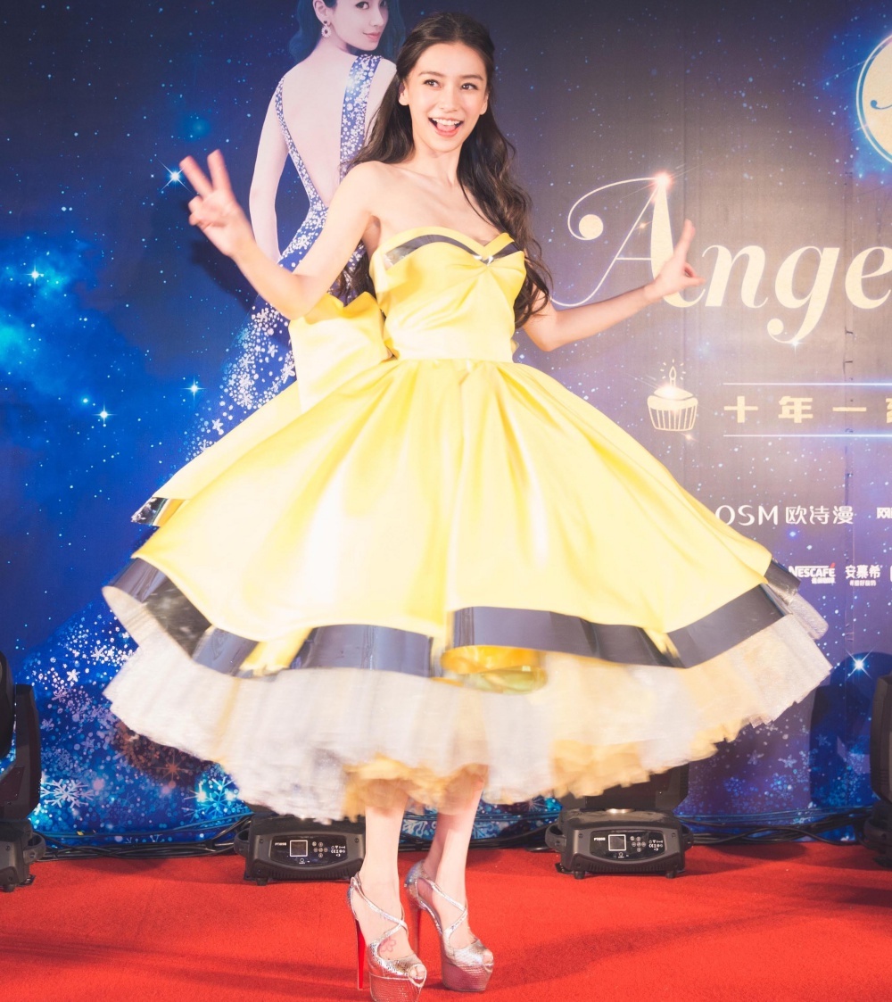 | Trong sự kiện mừng sinh nhật, Angelababy tự biến mình thành công chúa với đầm bồng màu vàng. Tuy niên dáng váy cúp ngực khiến cô mất điểm vì thân hình gầy trơ xương. |