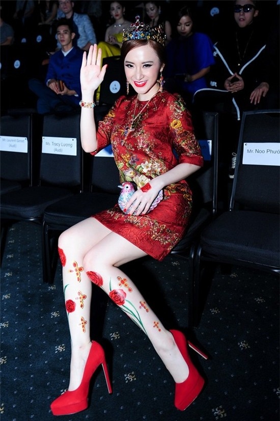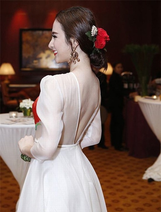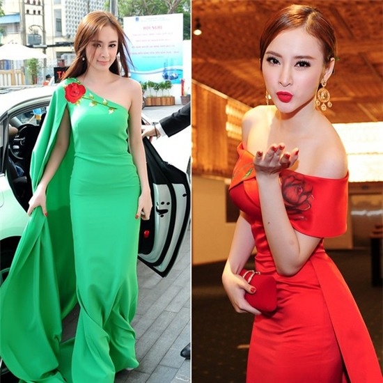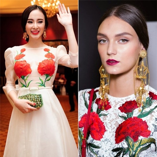 Angela Phương Trinh cũng nhanh chóng áp dụng "linh hồn" của BST Dolce&Gabbana vào thời trang thảm đỏ của mình trong thời gian qua. Tuy nhiên, thay vì những sắc hồng đỏ thắm phủ đầy trên những thiết kế thanh tao của Dolce&Gabbana thì cành hồng của Angela Phương Trinh lại vắt vẻo, "chỏn lỏn" giữa nền trang phục đơn sắc khá tẻ nhạt.