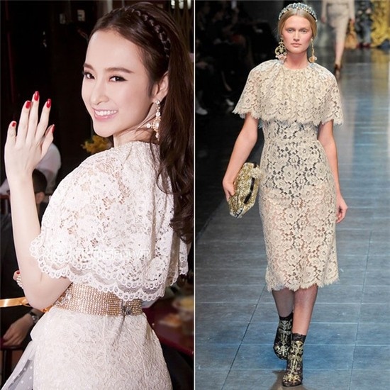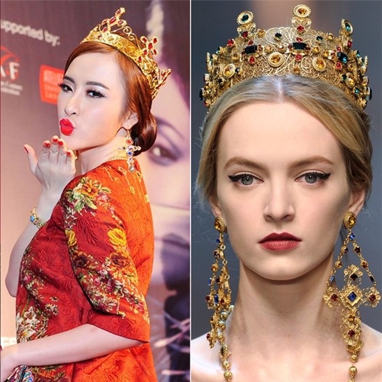 Ngoài việc diện những bộ đầm ren hao hao Dolce&Gabbana, Angela Phương Trinh còn phục sức giống y hệt bản gốc trên sàn diễn.