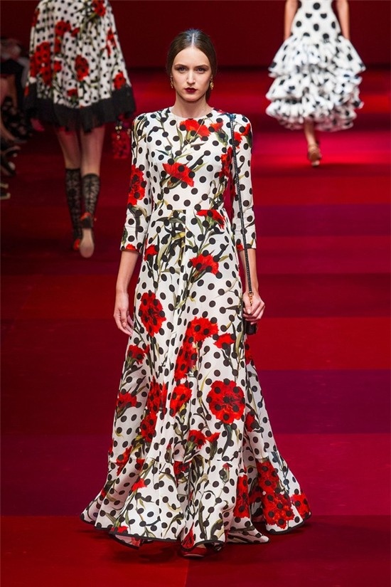 Hình ảnh hoa cẩm chướng còn được Dolce&Gabbana in lên vải hoặc thêu nổi và xen kẽ là hoạ tiết chấm bi đen trắng.