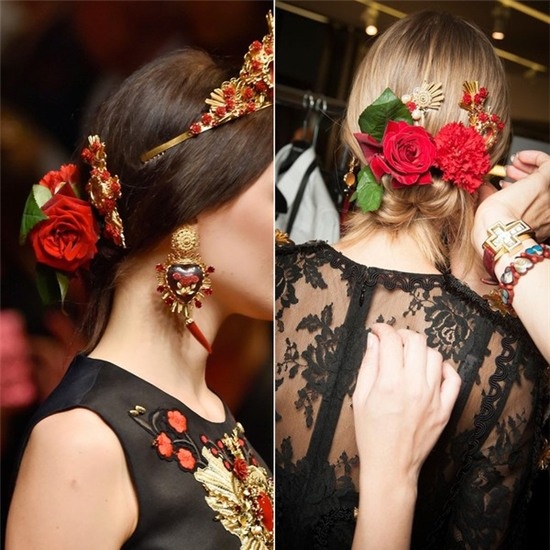 Phía sau hậu trường nơi chuẩn bị cho show diễn Xuân-Hè 2015 của Dolce&Gabbana đầy ắp những bông hoa hồng đỏ tuyệt đẹp để cài lên mái tóc của người mẫu.