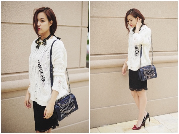 | Những ngày đầu đông, Hoàng Thùy Linh nổi bật trên phố với set trang phục áo len, chân váy nữ tính. Giày gam màu đỏ ửng chuyển đen sành điệu. Phụ kiện là túi xách Chanel cá tính. Trang phục hiện đại, năng động mang về cho cô những đánh giá cao về gu thẩm mỹ ổn định. |