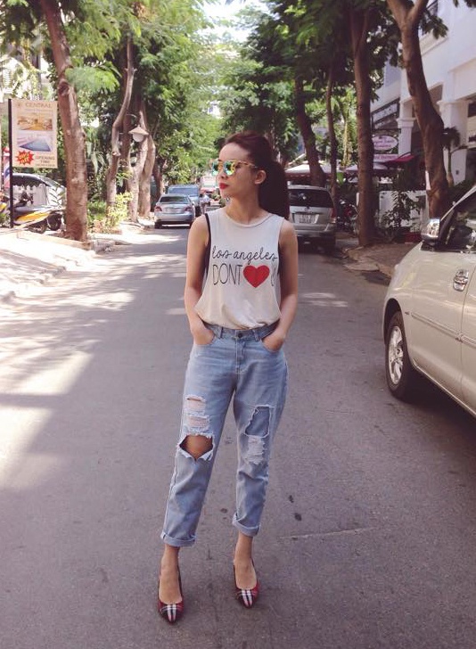 | Trong khi đó, "Én chị" Yến Trang khá phóng khoáng với quần jeans rách, kết hợp cùng áo thun khoét nách rộng. |