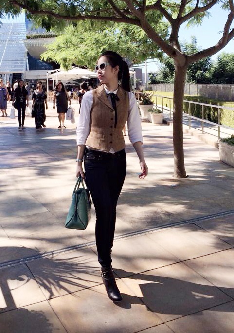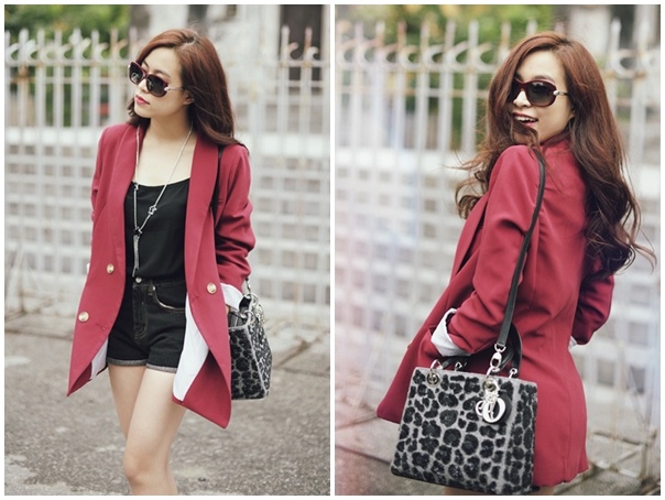 | Một dịp khác, nữ ca sĩ gợi cảm mang đến nét trẻ trung, nhã nhặn khi diện áo vest tông màu đỏ bordeaux kết hợp cùng áo thun và quần shorts jeans tối màu. Túi xách Dior họa tiết da báo làm điểm hút mắt nhìn. |