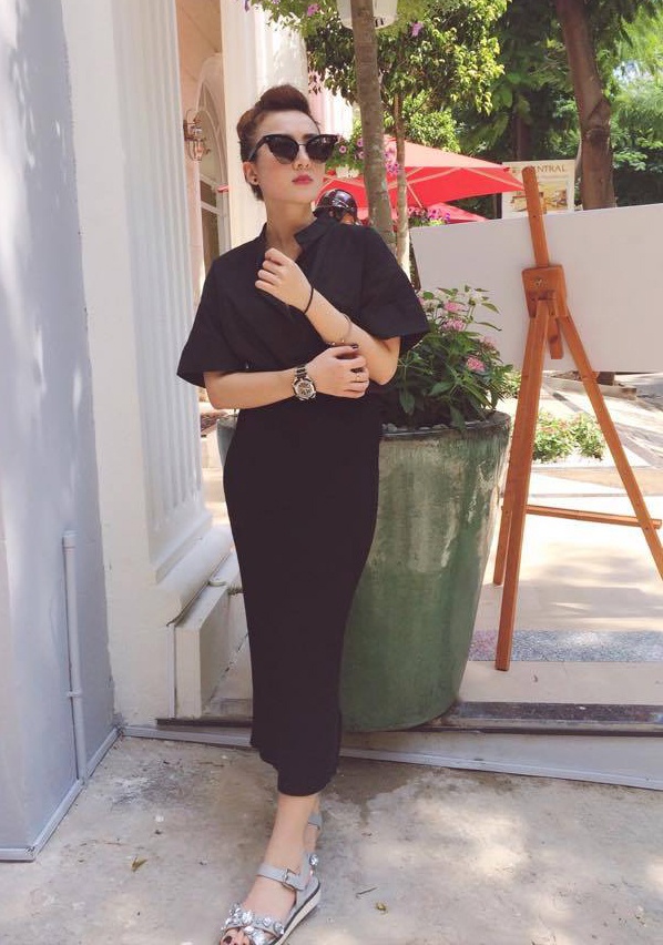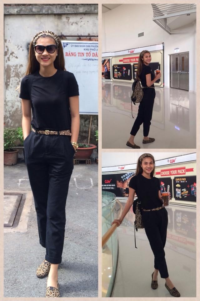 | Yến Nhi nổi bật trên đường phố Sài thành với bộ cánh tông màu đen thoải mái, giày sandals hiện đại. |