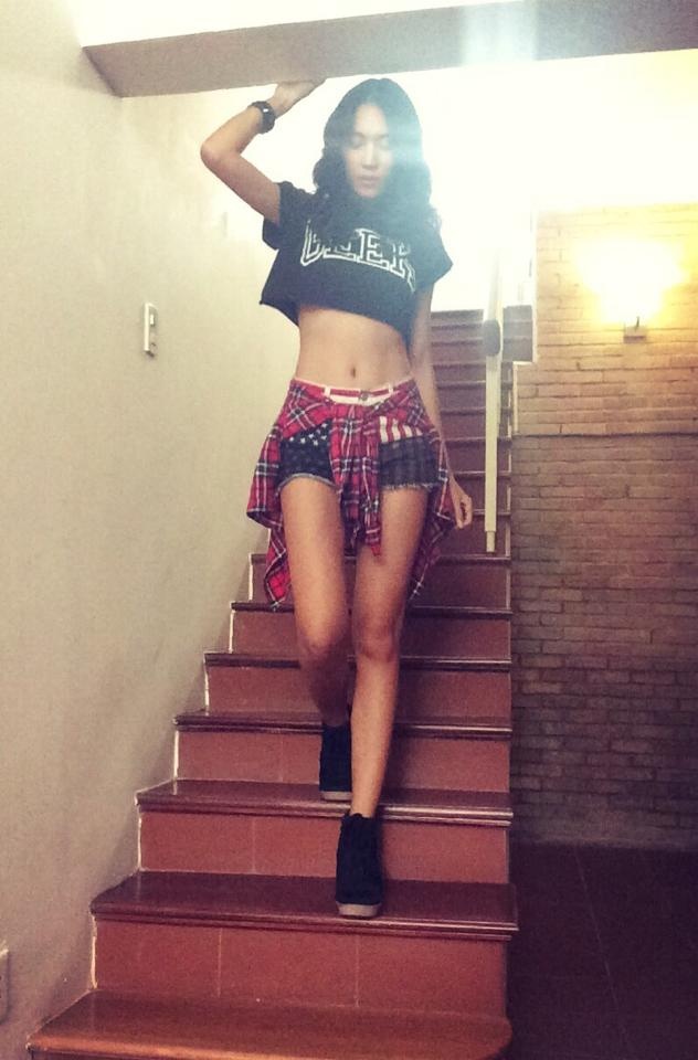 | Trong khi đó, Diệu Huyền không ngại khoe vòng eo thon với áo crop-top và quần jeans ngắn năng động. Cô không quên sử dụng áo sơ-mi ca-rô cột ngang hông tạo điểm nhấn cá tính. |