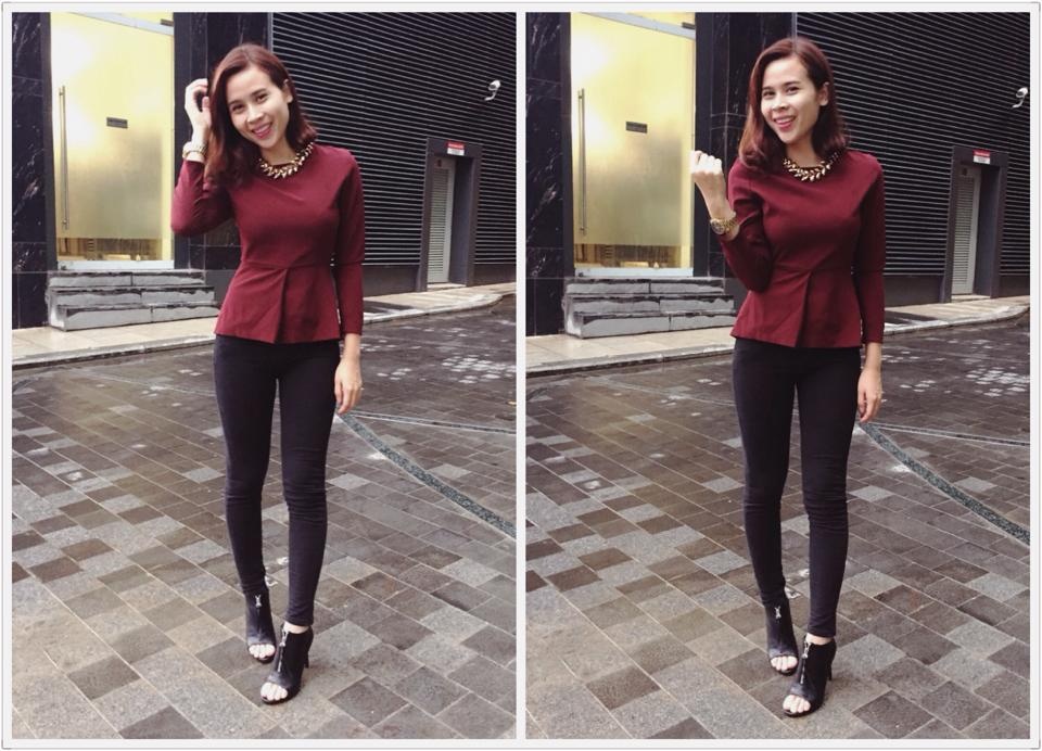 | Lưu Hương Giang khoe hình ảnh mới với bộ cánh mix hài hòa giữa tông màu đỏ bordeaux và quần đen ôm dáng sành điệu. Bà mẹ một con cho thấy vóc dáng cân đối cùng gu thẩm mỹ ổn định. |