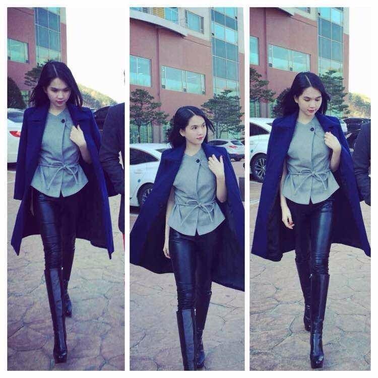 | Một ngày khác, "nữ hoàng nội y" diện áo măng tô màu nổi, cùng váy ngắn tối màu, boots cao cổ mix ăn ý phù hợp không gian mùa đông khi cô có buổi chụp ảnh quảng cáo tại Hàn Quốc trong tuần qua. |