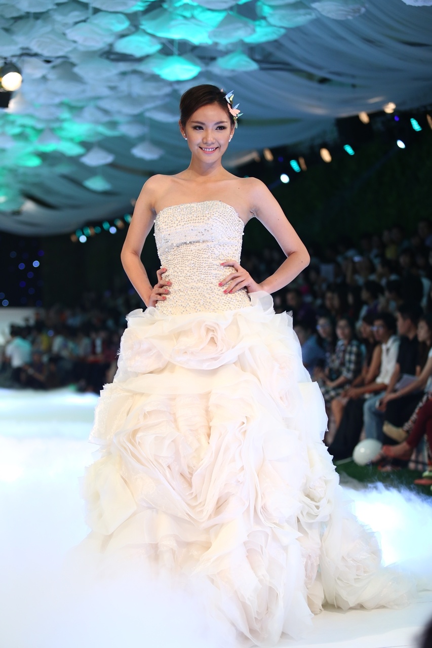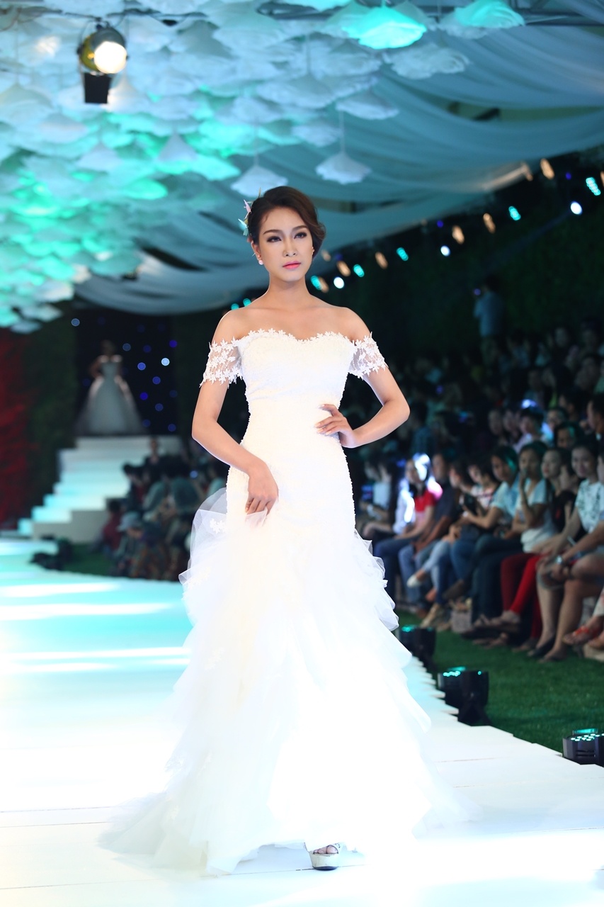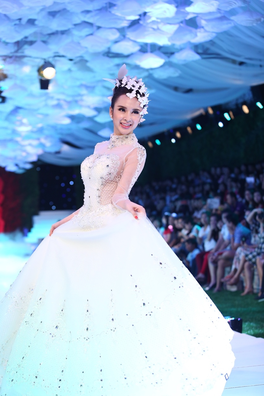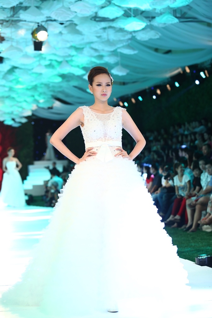 Lần đầu tiên làm vedette ở một show diễn áo cưới, người đẹp không mấy lo lắng do trước đó cô đã tập luyện khá kỹ lưỡng. Bà mẹ nhí diện một trang phục đính hạt ngọc trai kết hợp cùng họa tiết hoa mùa hè nổi bật sau cánh gà.