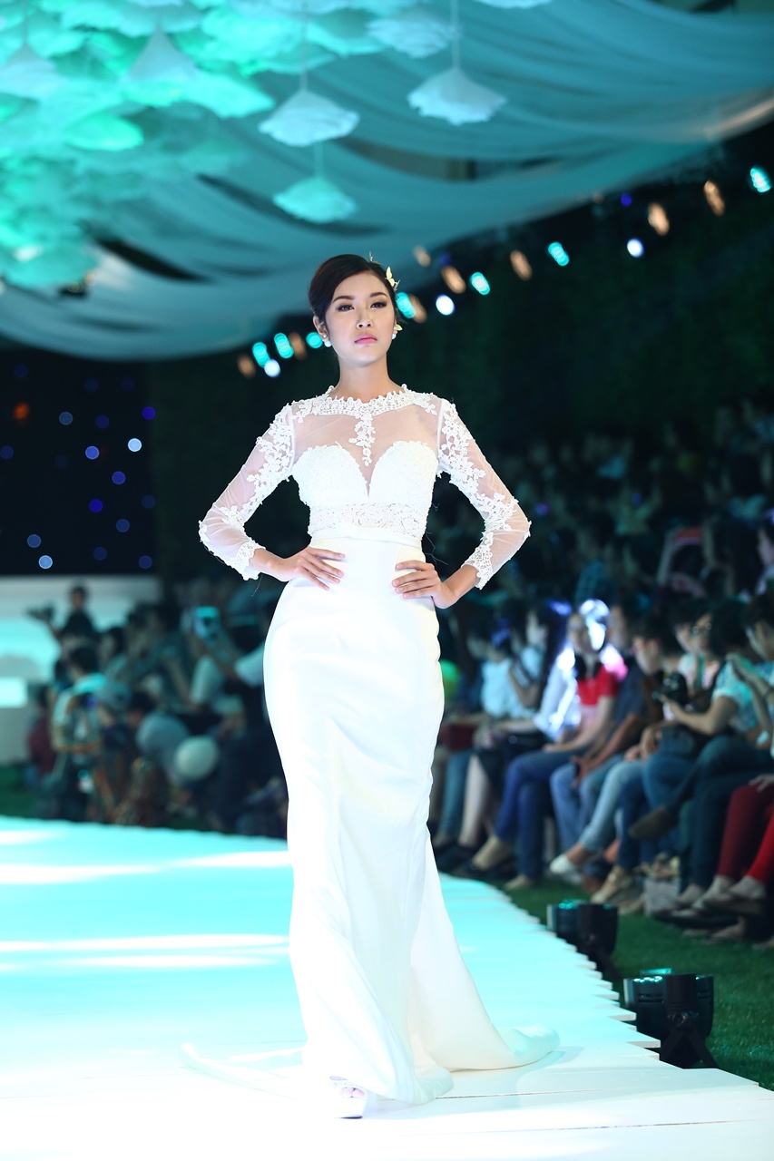 | Người mẫu Minh Triệu cũng góp mặt trong show diễn lần này. Người đẹp tươi cười, khác xa với vẻ đẹp cá tính, lạnh lùng thường thấy khi giới thiệu mẫu váy cưới mùa hè, |