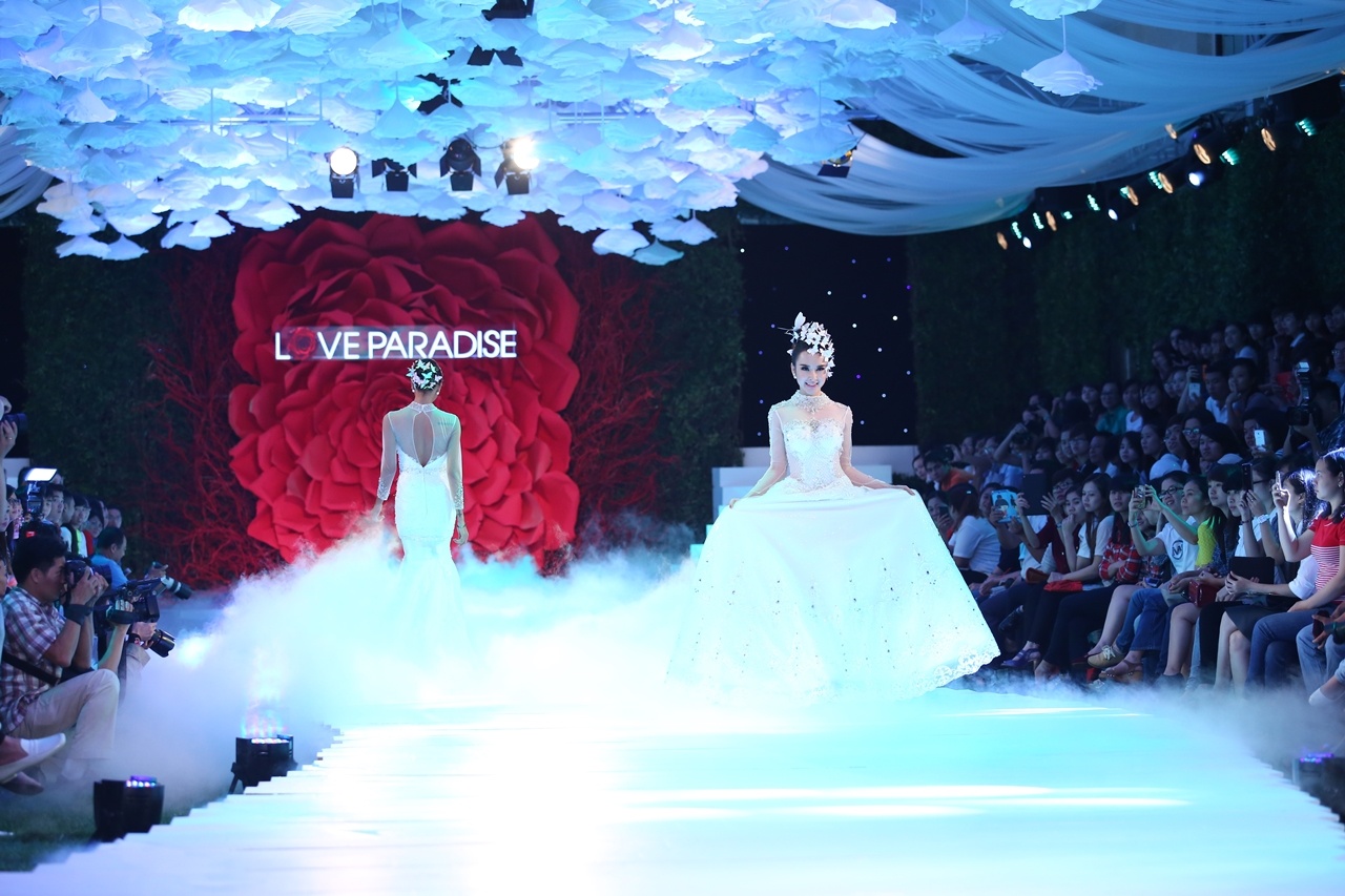 Sân khấu của triển lãm cưới Love Paradise 2014 khá lãng mạn với phông nền sân khấu là bông hoa hồng lớn nổi bật giữa không gian phủ đầy cây xanh. Không gian rộng mở, lãng mạn tạo cảm hứng cho dàn người mẫu tự tin sải bước.