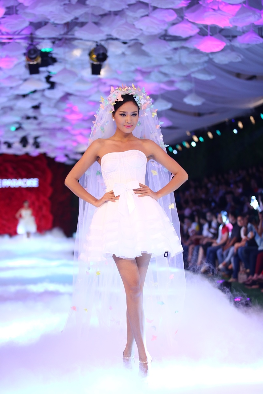 Người mẫu Quanh Đi đảm nhận vai trò mở màn, cô diện mẫu váy cưới ngắn khoe đôi chân thon dài. Đầu đội khăn voan mỏng nữ tính.