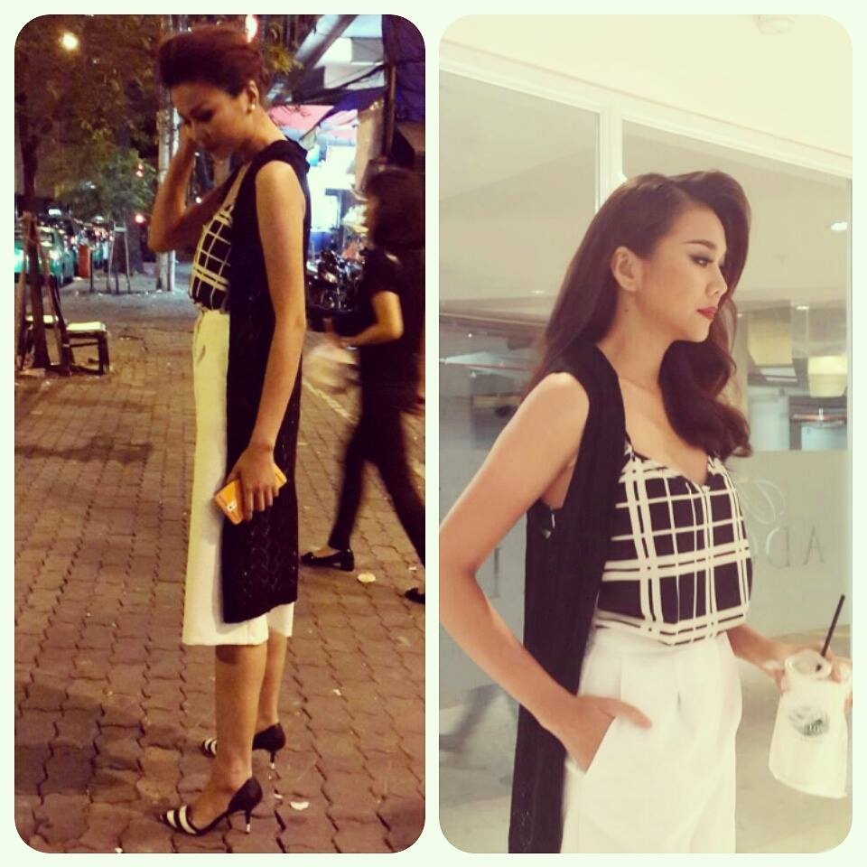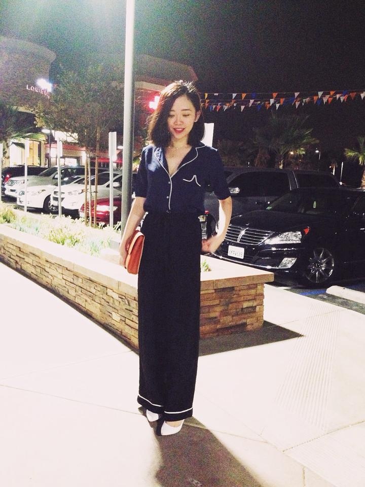 Trong những hình ảnh được đăng tải trên trang cá nhân, bộ cánh của người đẹp có tông màu xanh đậm, tối trầm làm nổi bật đường gân màu trắng tại cổ áo, gấu tay và lai quần. Trang phục có kiểu cách hơi hướng đồ ngủ mặc ở nhà nhưng được làm gọn với kiểu áo hơi ôm dáng và mẫu quần cạp cao hiện đại. Cũng với tài mix phụ kiện cá tính, tinh tế, bộ cánh trở thành trang phục ''đường phố'' hợp mốt.