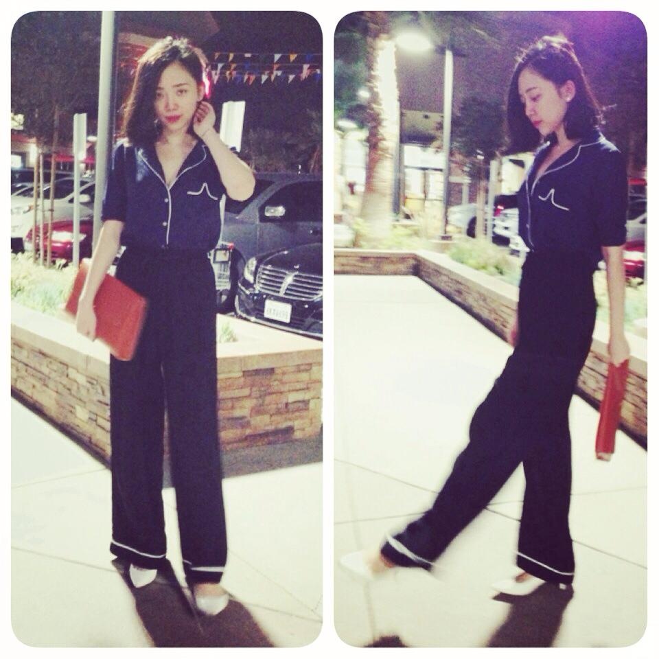 | Cô phối pyjama cùng giày cao gót, túi xách tông màu nổi bật. |