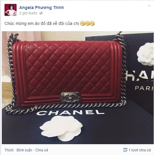 Mới đây, ''nữ hoàng thị phi'' đăng tải hình ảnh mới về chiếc túi Chanel vừa tậu, cô viết: ''Chúc mừng em áo đỏ đã về đội của chị''. Mẫu túi mới của Phương Trinh thuộc dòng Chanel Boy có giá dao động khoảng 5 - 7.000 đôla, tùy chất liệu và kiểu dáng.