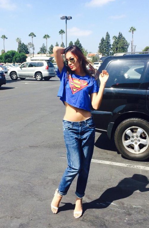 Nữ người mẫu Diệu Huyền đang có chuyến công tác tại Mỹ, trên đường phố, cô tự tin phô diễn vòng eo hoàn hảo với áo crop-top và quần jeans baggy xắn gấu.