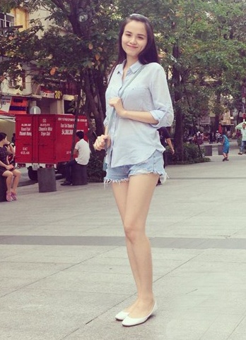 Người mẫu Kim Dung diện trang phục denim cá tính, khoe vòng eo thon gọn khi thả bộ trên một con phố gần nhà.