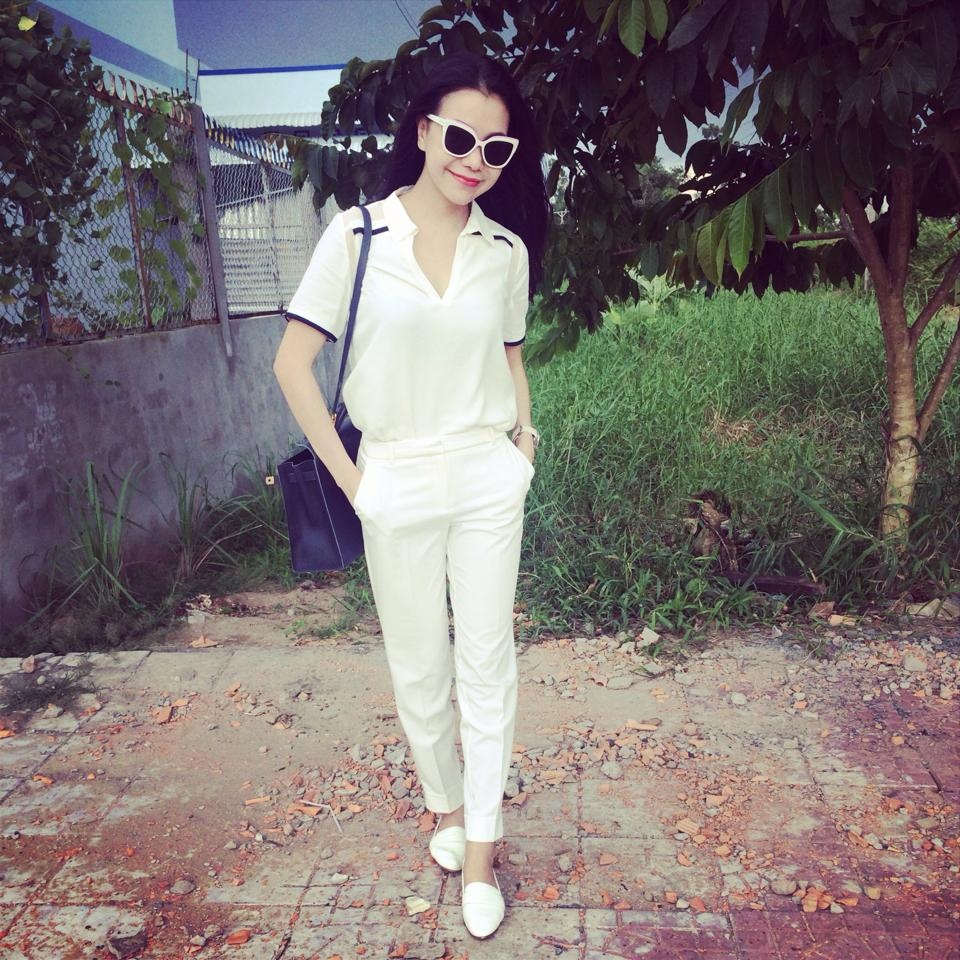 Diện bộ cánh ton-sur-ton màu trắng, Trà Ngọc Hằng nổi bật khi có chuyến về quê dã ngoại.
