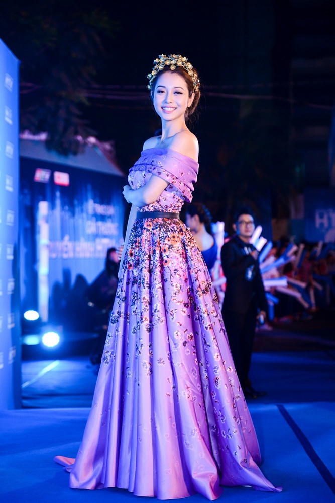 | Trên thảm đỏ lễ trao giải thưởng truyền hình HTV (HTV Awards) lần thứ 8, bà mẹ hai con Jennifer Phạm thu hút sự chú ý với trang phục dạ hội in hoa lãng mạn của Lê Thanh Hòa. Hình ảnh của cô táo bạo hơn với chiếc vòng hoa cài tóc mới lạ. Bộ váy gam màu tím hợp xu hướng, hình ảnh thân thiện kèm nụ cười rạng rỡ giúp Hoa hậu châu Á tại Mỹ có tên trong nhiều danh sách mặc đẹp. |
