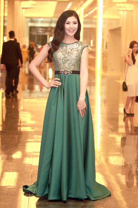 Đến ủng hộ NTK Hoàng Hải tổ chức show diễn kỷ niệm 18 năm làm nghề, hoa hậu Ngọc Hân nổi bật với thiết kế gam xanh lá đậm hợp trào lưu màu sắc thế giới. Thân váy bồng bềnh nữ tính kết hợp cùng mẫu áo ren thêu cầu kỳ phối hài hòa cùng mái tóc uốn gợn sóng toát lên vẻ thanh lịch.