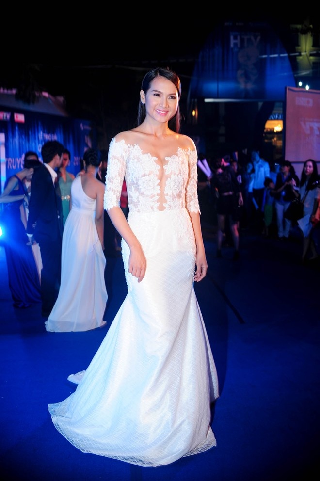 Cùng tham dự lễ trao giải truyền hình HTV (HTV Awards) lần thứ 8, siêu mẫu Thanh Hằng diện bộ váy tông màu trắng tinh tế của NTK Huy Trần. Trang phục được tối giản phụ kiện có điểm nhấn trên thân áo là thắt nơ duyên dáng. Bộ cánh cổ điển, thanh lịch và không kém phần sang trọng giúp nữ diễn viên Mỹ nhân kế nhận được nhiều lời khen.
