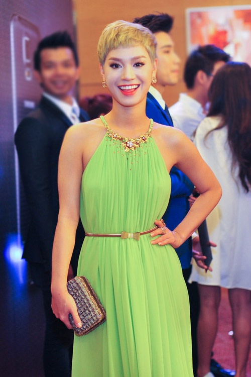 Tham dự cùng một sự kiện với Maya, nhưng nữ ca sĩ Trà My lại xây dựng hình ảnh vừa cá tính lại vừa nữ tính khi diện trang phục váy nhẹ nhàng kết hợp mái tóc tém màu vàng nổi bật. Hình ảnh của cô được ghi nhận là khá phù hợp với hình tượng mạnh mẽ vốn có, đồng thời gam màu tóc và váy được kết hợp khá ăn nhập.