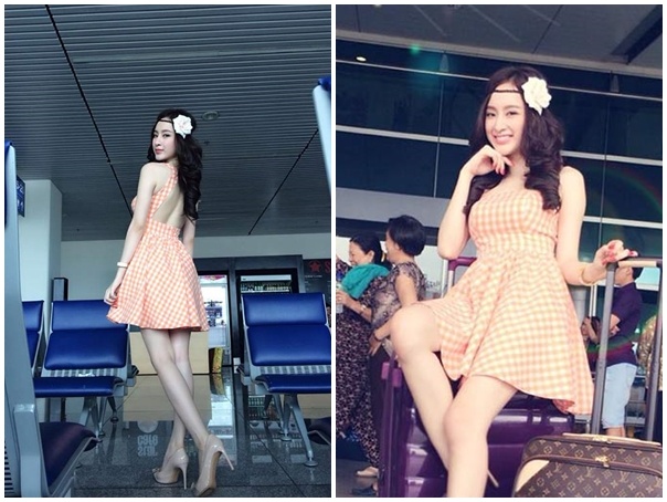 Tại sân bay Tân Sơn Nhất, ''nữ hoàng thị phi'' nổi bật trong bộ váy chất liệu cotton thoáng mát, họa tiết ca-rô trẻ trung.