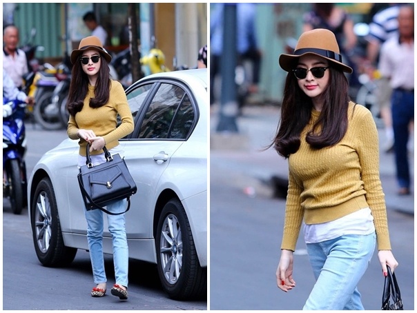 Thỉnh thoáng, nữ diễn viên phối trang phục đơn giản với áo thun, quần jeans, mữ fedora và túi hàng hiệu ăn nhập tổng thể.