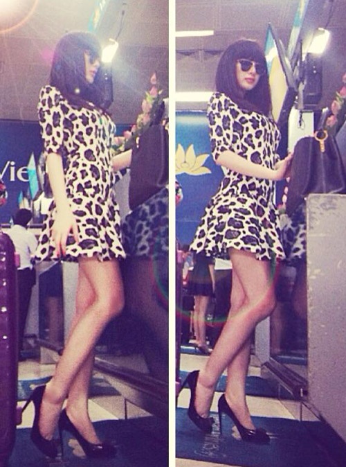 Thời trang sân bay của nữ diễn viên Tiểu thư đi học cũng rất sành điệu với mốt họa tiết da báo, chân váy xòe và kính râm cá tính.