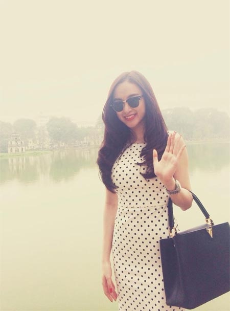 | Đôi khi, nữ diễn viên cũng rất yêu thích mẫu đầm chấm bi cổ điển, kín đáo. Cô không quên mang theo chiếc túi hàng hiệu làm điểm nhấn nhá. |