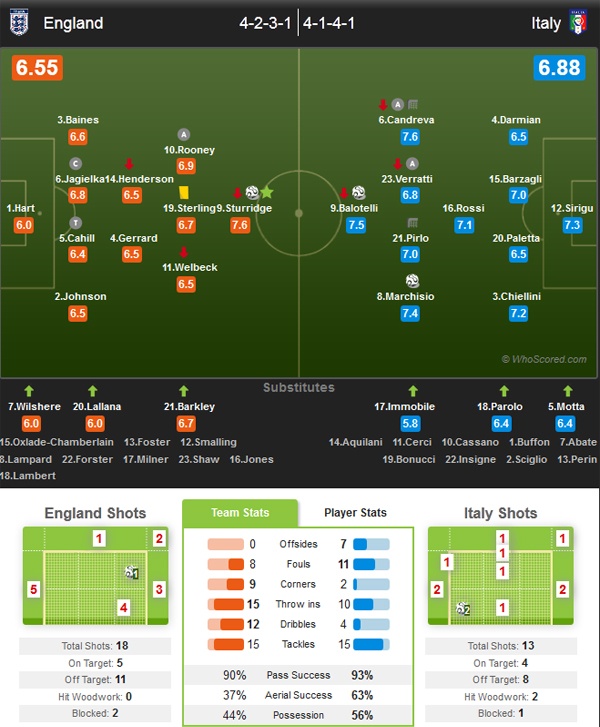 Tốc độ và sự di chuyển linh hoạt của các mũi nhọn gồm Sterling, Welbeck, Sturridge và Rooney khiến các hậu vệ của Italy phải làm việc vất vả trong những phút đầu trận. Đáng tiếc là Tam sư không tận dụng thành công cơ hội trước khung thành thủ môn Sirigu.