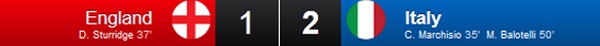 Kết thúc trận đấu, Italy giành chiến thắng chung cuộc 2-1 trước ĐT Anh.
