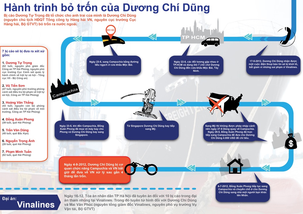 Bị cáo Vũ Tiến Sơn (48 tuổi, nguyên Phó trưởng phòng cảnh sát điều tra tội phạm về trật tự xã hội, Công an TP Hải Phòng). Sơn cùng Dương Tự Trọng bàn bạc, thống nhất về việc liên lạc, phối hợp điều khiển mọi hoạt động của các bị can và những người khác tổ chức cho Dương Chí Dũng trốn trót lọt sang Campuchia.