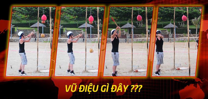 | Pharell Phương vất vả trong màn bịt mắt đập bóng. |