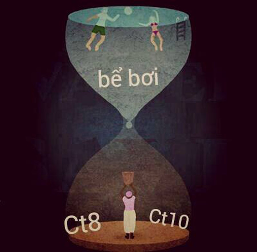 | Sự khác biệt giữa một bên là bể bơi chung đầy nước và một bên là người dân chờ hứng từng giọt. |