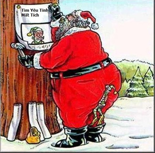 | Ông già Noel được biết đến với hình tượng một ông lão bụng to, béo tốt. Vì vậy rất nhiều ảnh chế "nhấn mạnh" đến đặc điểm nhận dạng này. Trong ảnh, ông già béo đến nỗi không xuống nổi qua ống khói, khiến chú tuần lộc phải hỗ trợ bằng cách rất chi là bạo lực. |