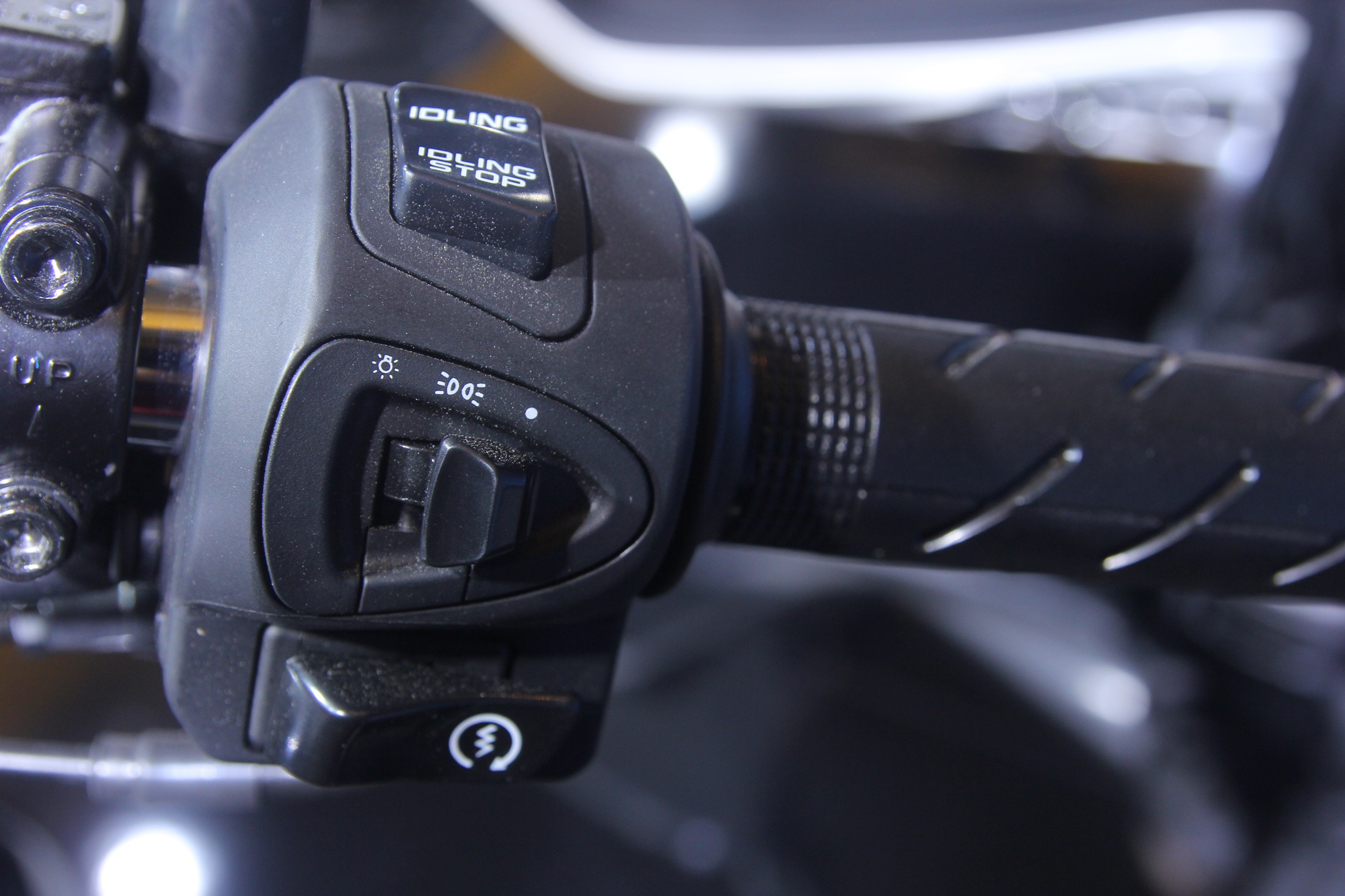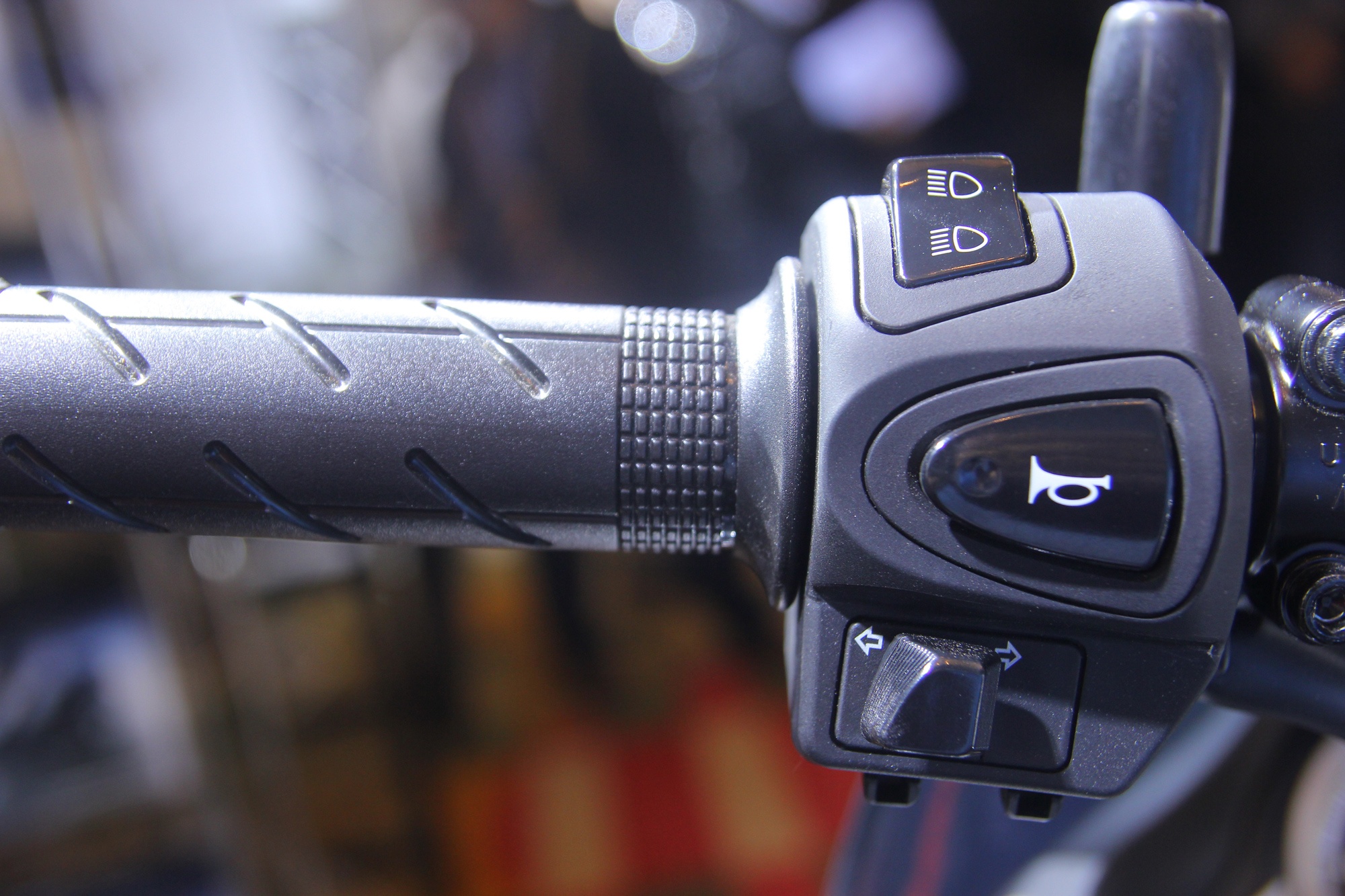 Tay trái với các nút chức năng như công tắc xi-nhan, chế độ chiếu sáng và còi.