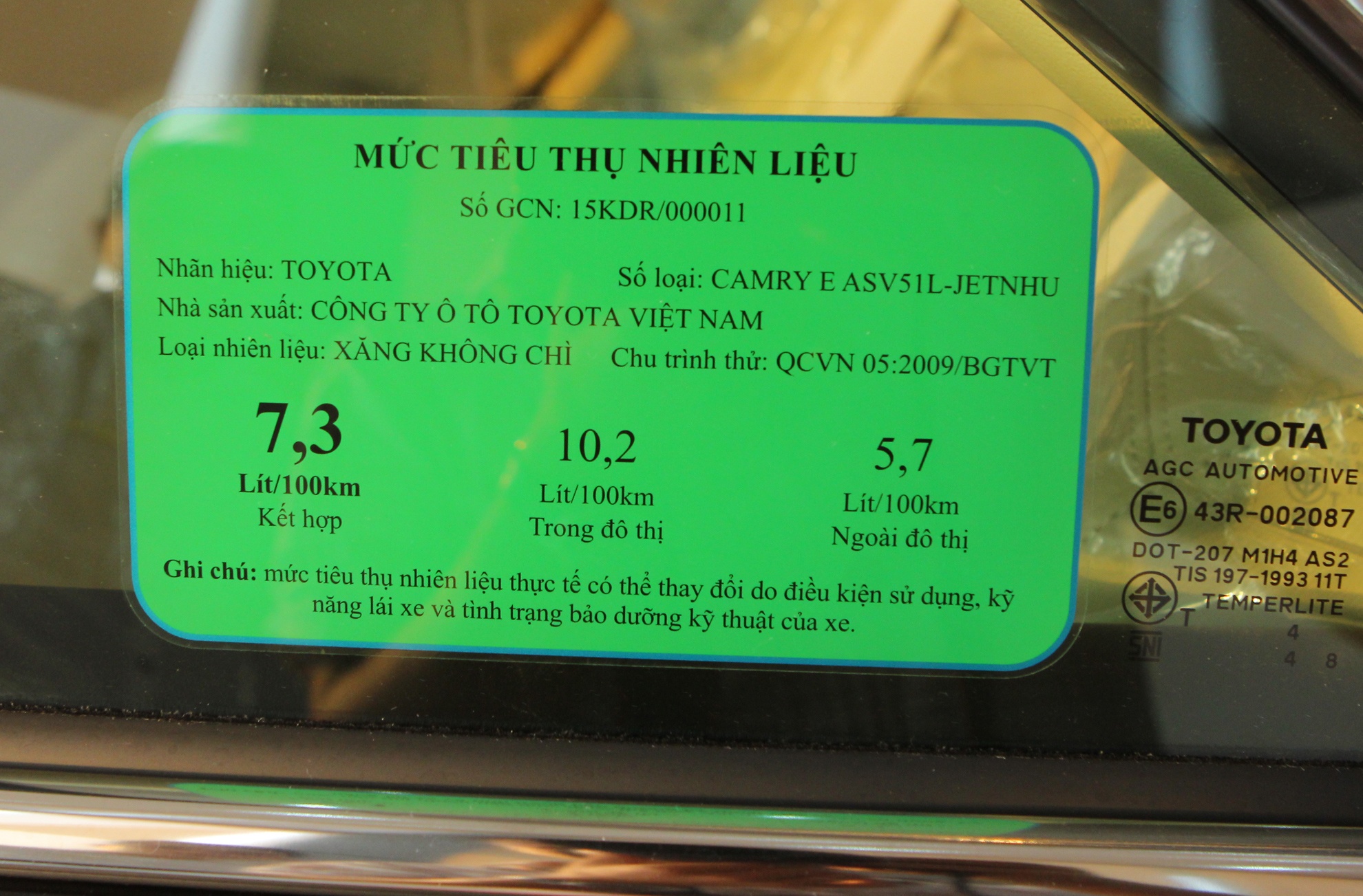 Camry 2.0E tiêu thụ 7,3 lít/100 km đường hỗn hợp; 10,2 lít/100 km trong đô thị và 5,7 lít/100 km đường cao tốc.