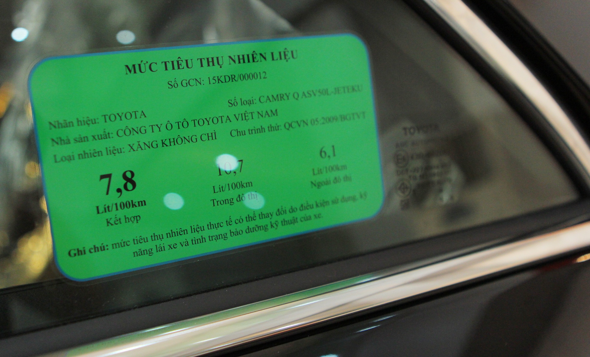 Các model đều được dán tem năng lượng màu xanh lá cây trên ô cửa kính phía sau do Cục đăng kiểm Việt Nam cấp. Bản 2.5Q có mức tiêu thụ kết hợp 7,8 lít/100 km.