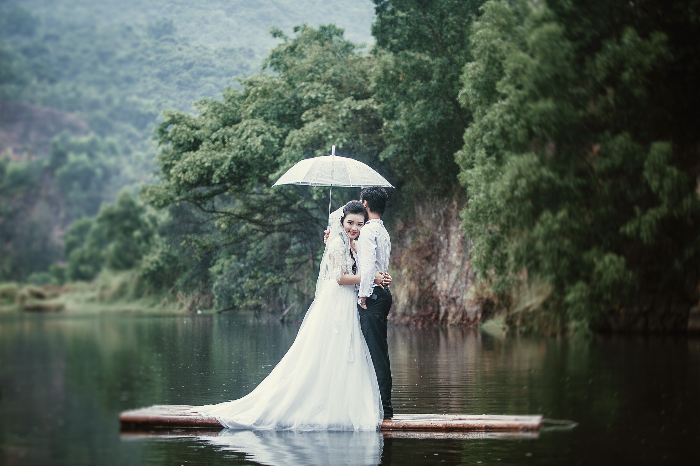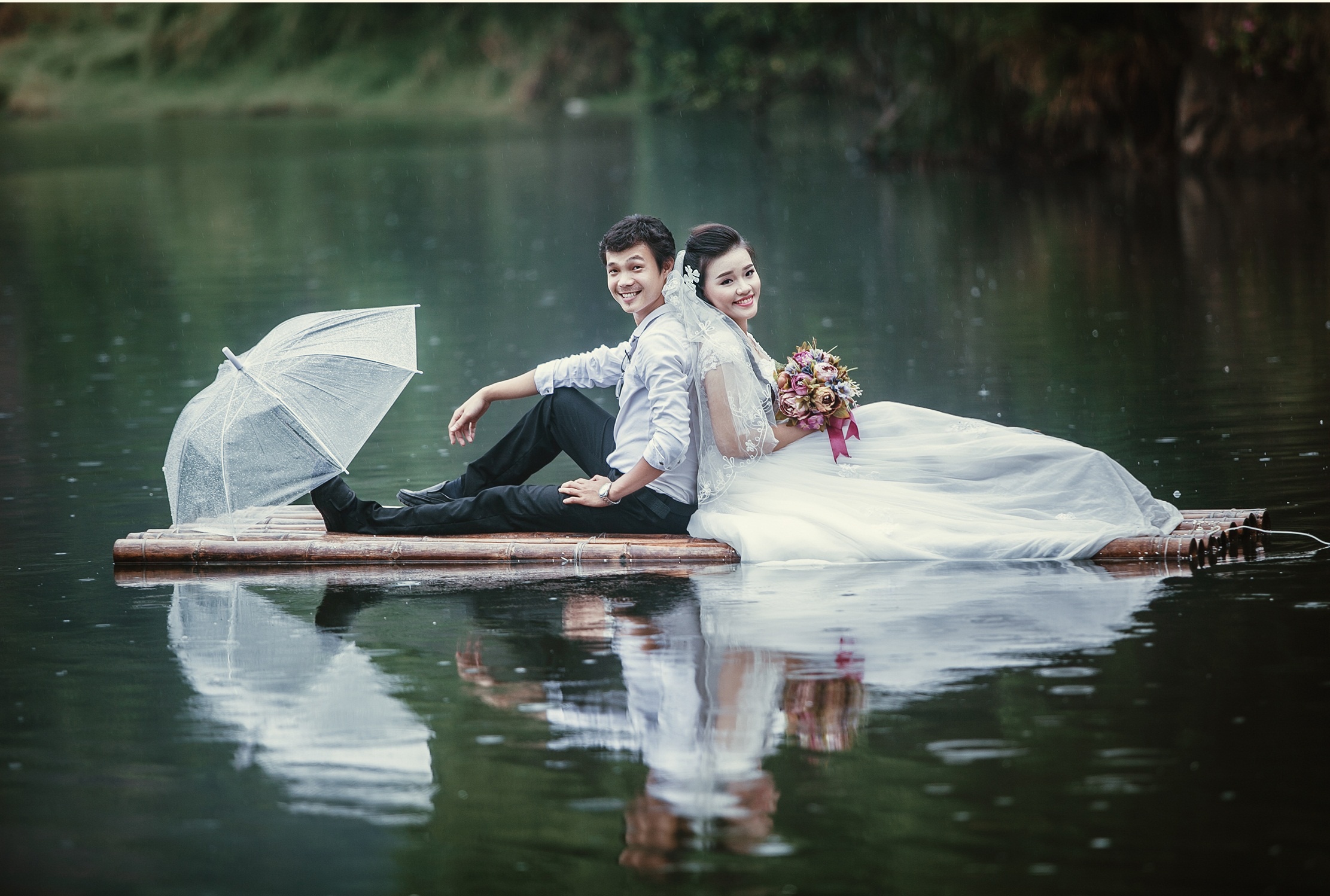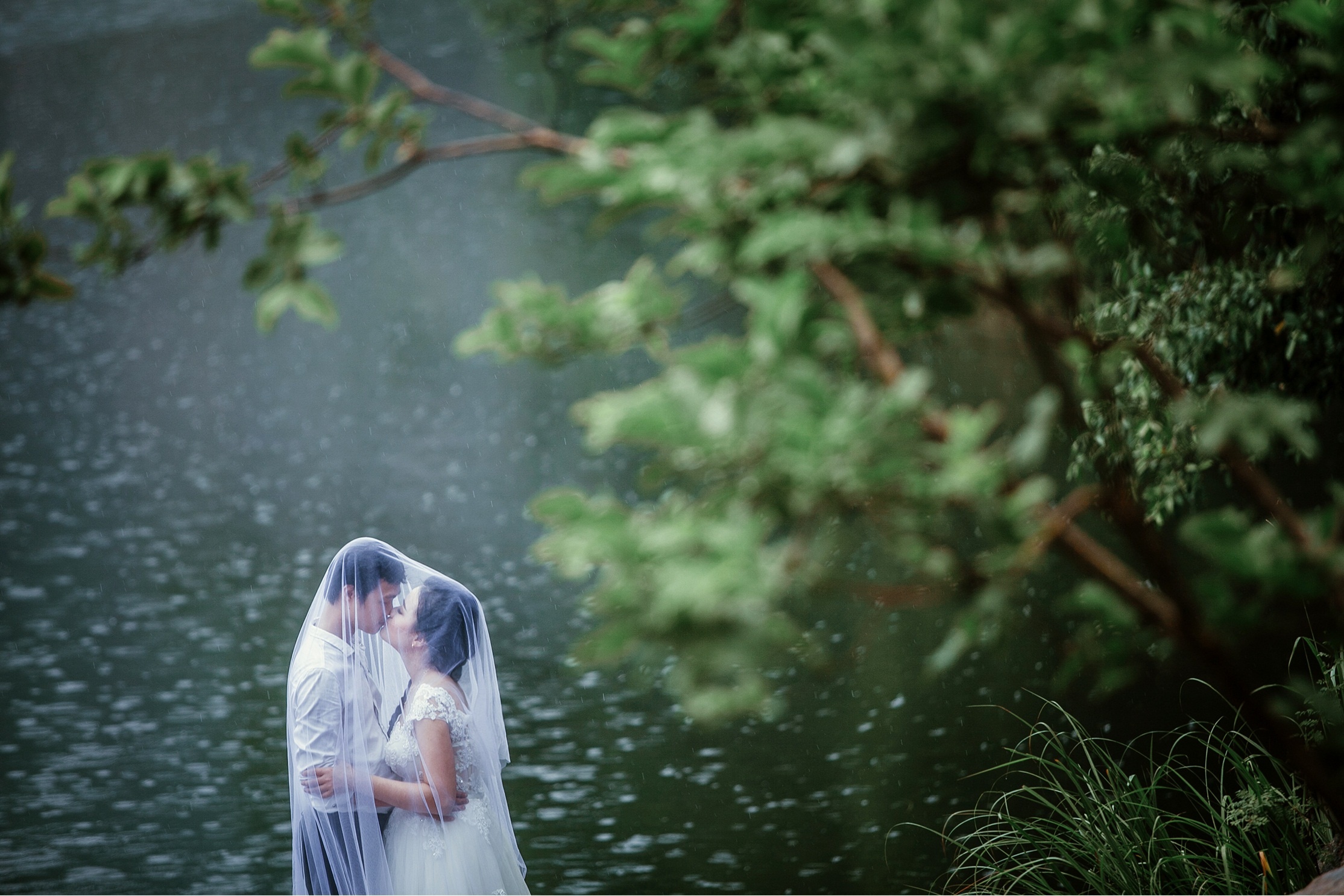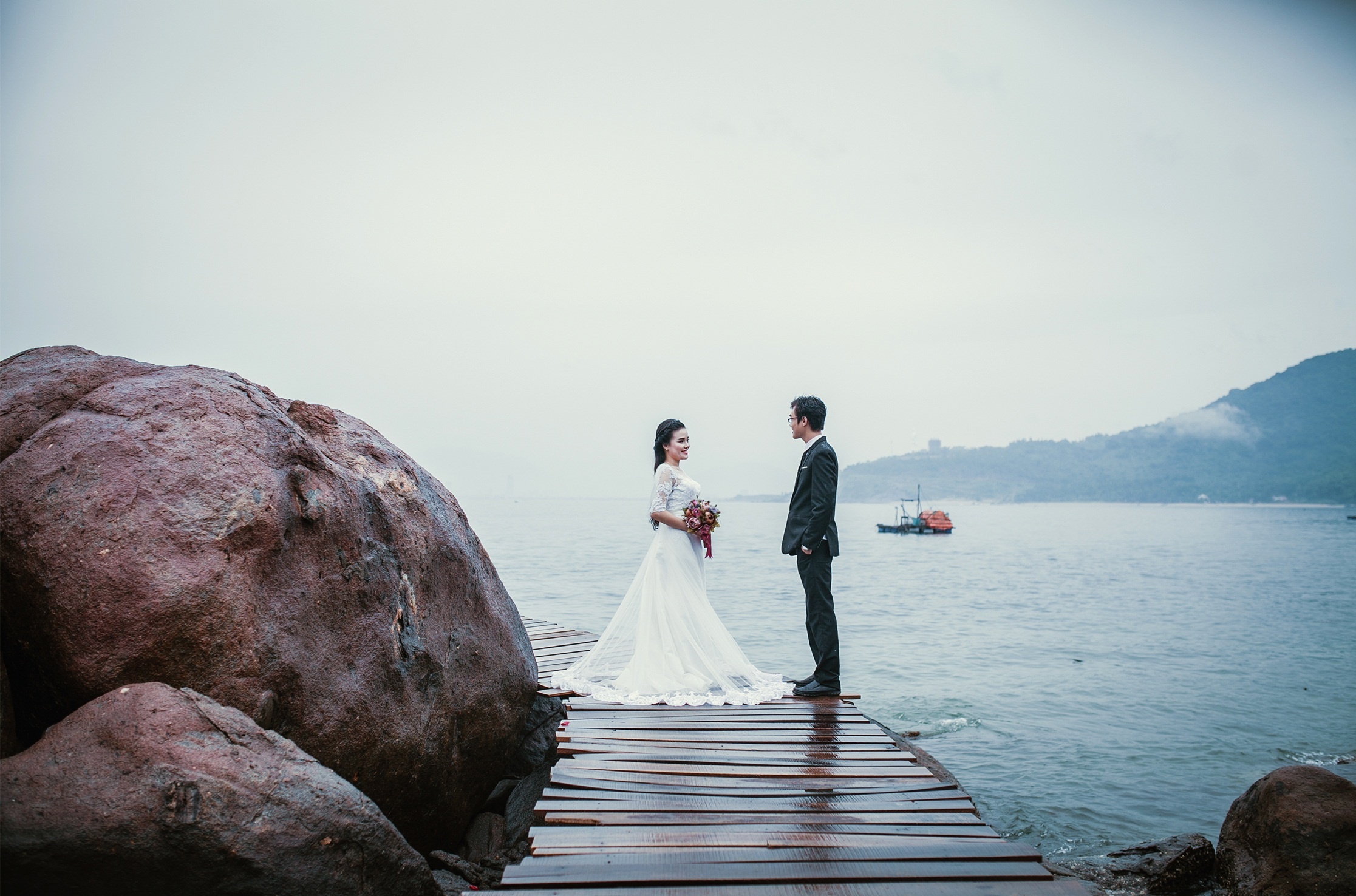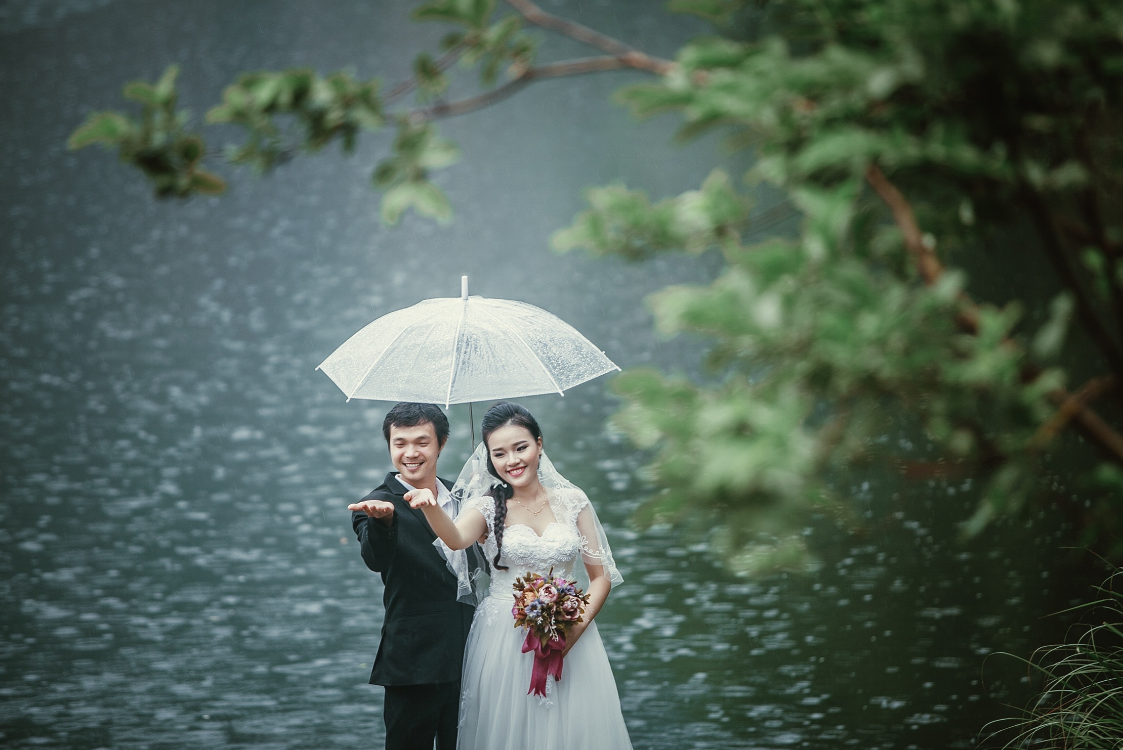 | Nhiếp ảnh gia Nhật Hoàng chia sẻ: "Chụp ảnh dưới mưa là trải nghiệm thú vị mà tôi may mắn có được. Cả ê-kíp vất vả dầm mưa nhiều tiếng đồng hồ để có được những bức ảnh đẹp. Khoảnh khắc cô dâu, chú rể đứng trên bè gỗ ở giữa Hồ Xanh là cảnh tôi lo lắng nhất vì rất dễ ngã. Tuy nhiên, cặp đôi đã thể hiện khá tốt". |