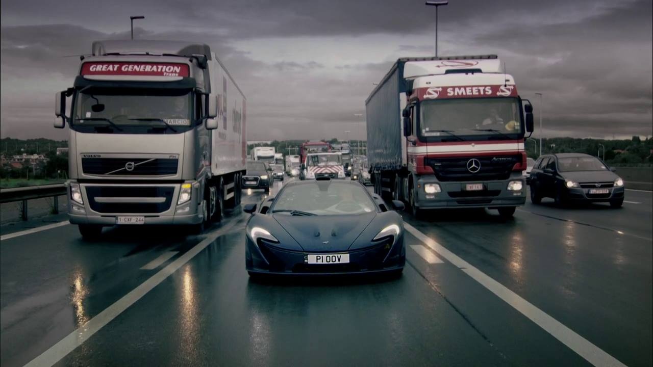 | Siêu xe McLaren P1 lạc giữa hai chiếc xe tải hạng nặng. Ảnh: Shmee150. |