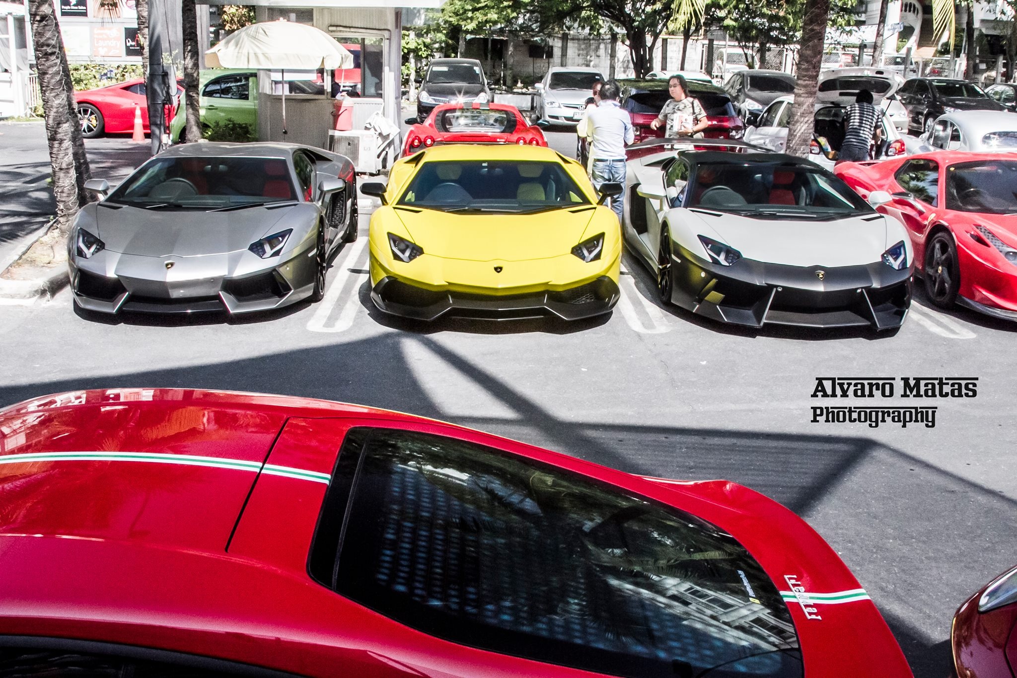 | Một bãi đỗ toàn ngập siêu xe, với 3 chiếc Lamborghini Aventador và siêu xe của Ferrari. Ảnh: Alvaro Matas. |