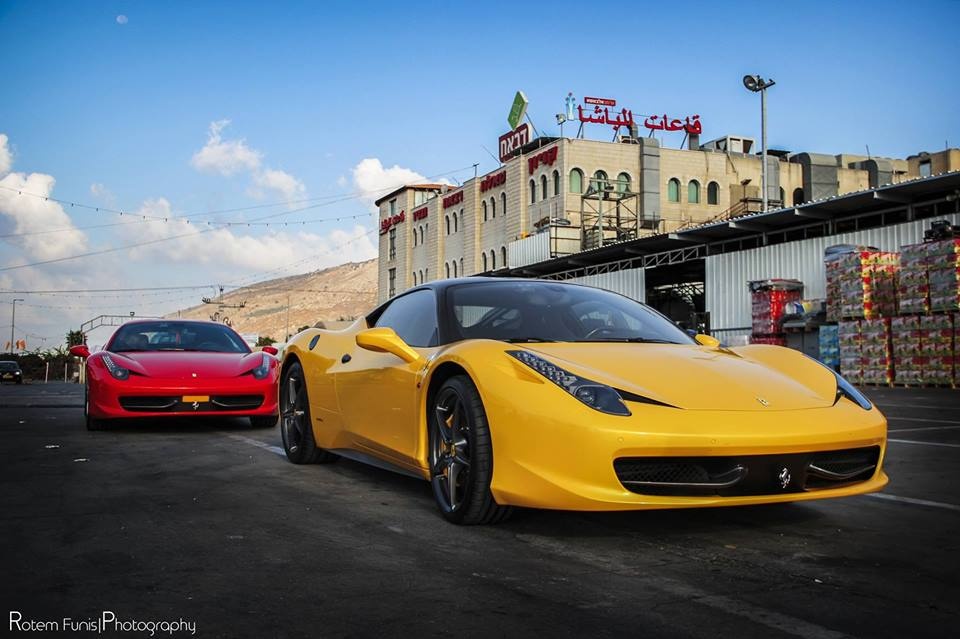 | Bộ đôi Ferrari 458 vàng và đỏ trên đường phố Israel. |