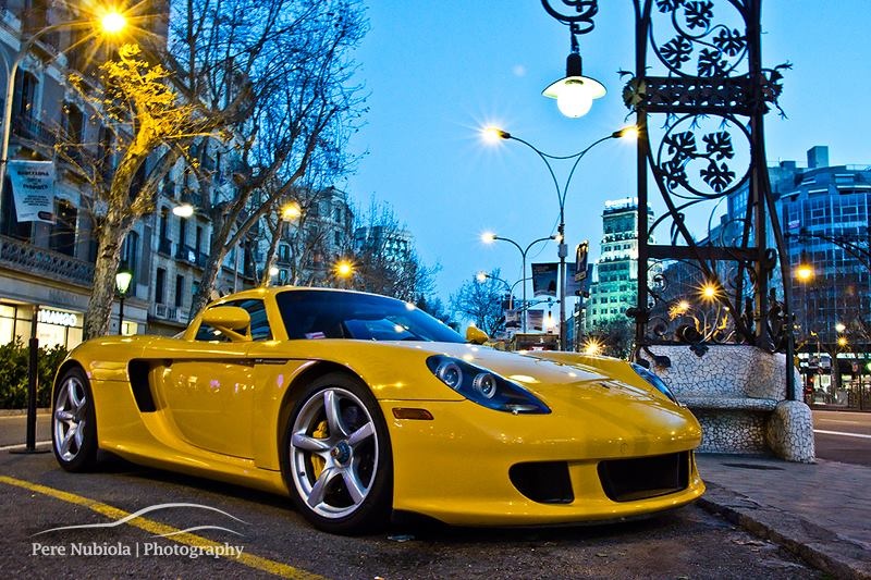 | Porsche Carrera GT màu vàng lung linh trong ánh đèn phố về đêm. Đây là một trong những mẫu xe nổi tiếng nhất của hãng xe Đức. Ảnh: Pere Nubiola |